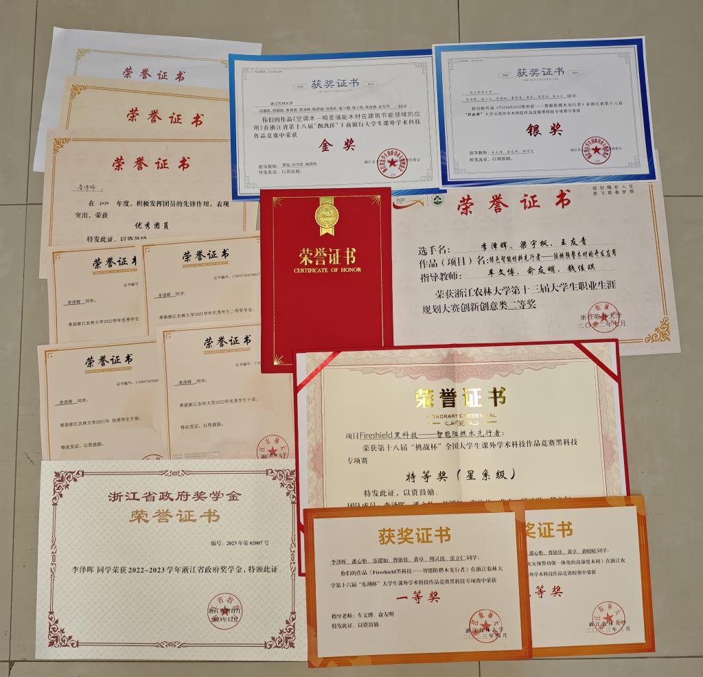李澤暉,中共黨員,化學與材料工程學院木材科學與工程204班學生,浙江省優(yōu)秀畢業(yè)生。大學期間,李澤暉的總績點位居專業(yè)前列,連續(xù)三年獲優(yōu)秀學生獎學金,曾獲浙江省政府獎學金、浙江省“尚德學子”獎學金,發(fā)表SCI論文兩篇,申請國家發(fā)明專利一項,獲“挑戰(zhàn)杯”省級銀獎和金獎、國家級特等獎等,多次獲得優(yōu)秀學生干部、優(yōu)秀團員等榮譽。