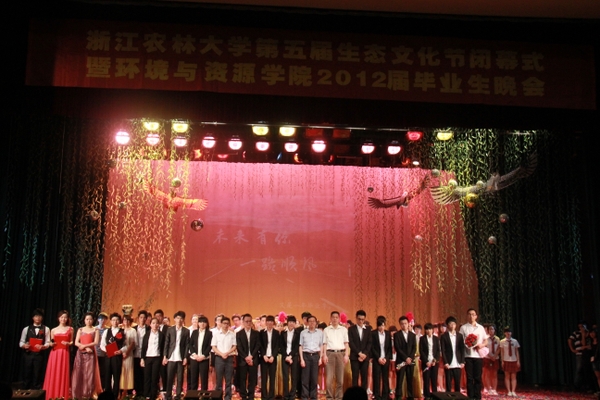 浙農林大新聞網訊  6月3號晚,校第五屆生態文化節閉幕式暨環境與資源學院2012屆畢業晚會在東湖校區活動中心影劇院正式拉開帷幕。校黨委學工部部長張敏生,環資學院執行院長姜培坤、黨總支書記韋新良,以及宣傳部、建設處、校團委、各二級學院相關負責人共同出席本次晚會,與我院師生公話生態,共享暖暖畢業情。