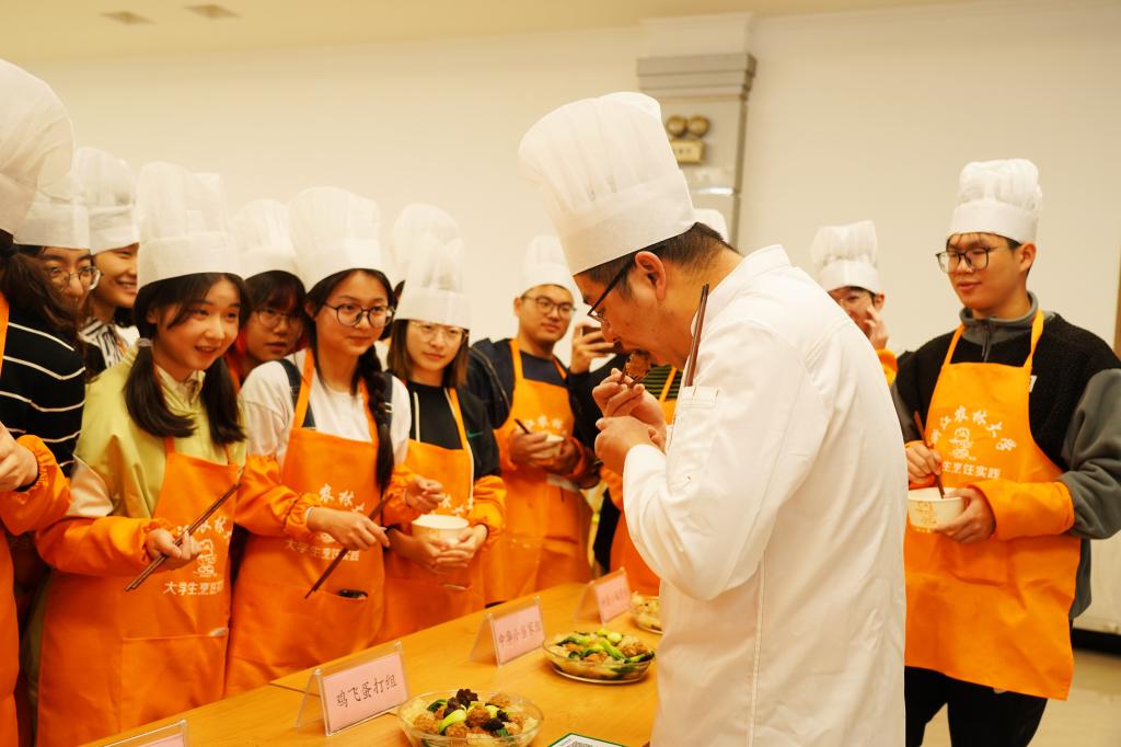 隨后,學(xué)生們學(xué)著切菜燒菜,“董大廚”則一邊指導(dǎo)一邊講解烹飪每道菜需要掌握的切菜要領(lǐng)、燒菜技巧、營養(yǎng)成分……董銘華說,“能夠教會(huì)學(xué)生掌握一些烹飪的技藝,我覺得和做廚師一樣有意義、有成就感。”