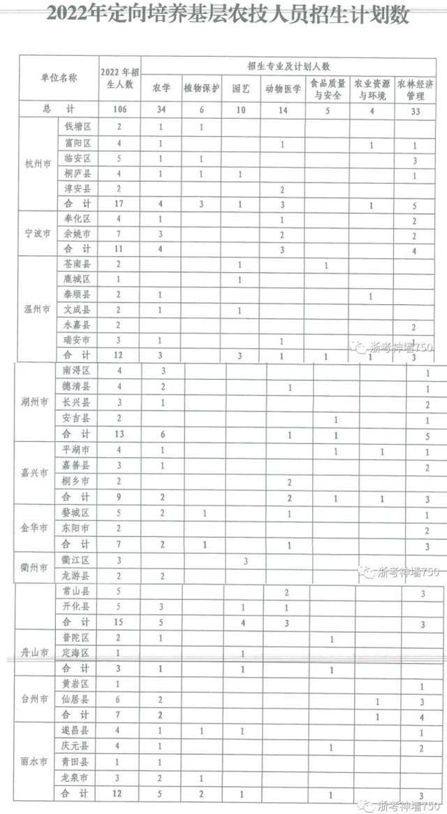 2022年,浙江農(nóng)林大學繼續(xù)承擔定向培養(yǎng)基層農(nóng)技人員工作。該項目由浙江省農(nóng)業(yè)農(nóng)村廳、省教育廳、省人力資源和社會保障廳等三部門聯(lián)合開展,今年面向杭州、溫州 、金華、衢州、麗水等10個地區(qū)的浙江省考生招生(招聘)定向培養(yǎng)基層農(nóng)技人員106名。專業(yè)包括農(nóng)學、植物保護、園藝、動物醫(yī)學、食品質(zhì)量與安全、農(nóng)業(yè)資源與環(huán)境、農(nóng)林經(jīng)濟管理等7個本科專業(yè),全部安排在高校招生普通類提前錄取,招生代碼:0211。其中動物醫(yī)學專業(yè)學制為五年,其他6個專業(yè)學制為四年。