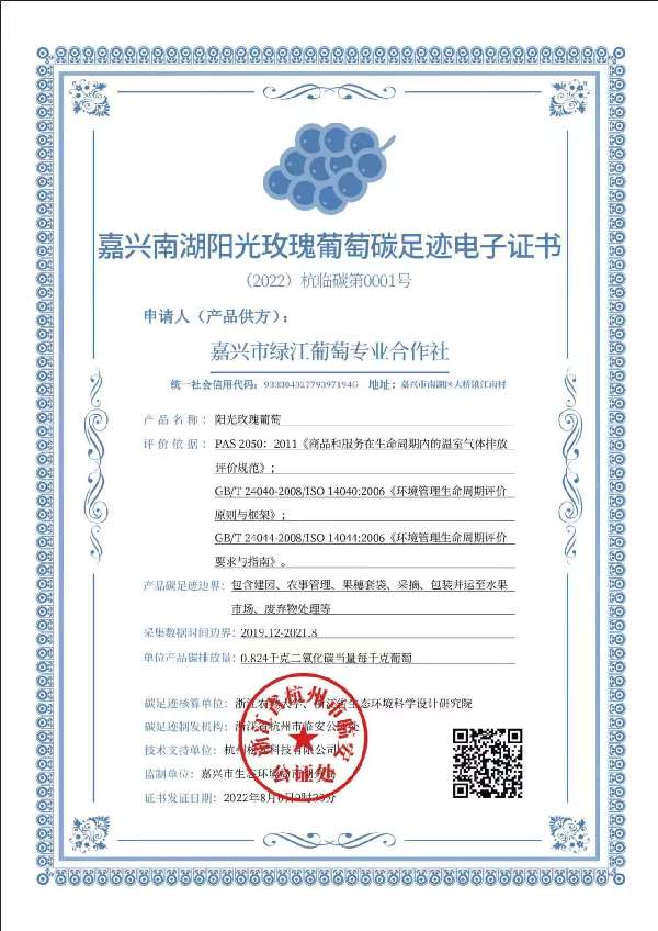 那么什么是碳標(biāo)簽?zāi)兀俊疤紭?biāo)簽”就是寫有商品整個(gè)生命周期中的溫室氣體排放量的標(biāo)簽,項(xiàng)目團(tuán)隊(duì)跟蹤、計(jì)量了綠江合作社27畝陽光玫瑰葡萄7類41個(gè)流程中的碳排放量,包括建園、農(nóng)事管理、到采摘、包裝等,計(jì)算出每公斤陽光玫瑰葡萄會(huì)產(chǎn)生0.824千克二氧化碳,相當(dāng)于日常家電大約1度電的碳排放量。“碳標(biāo)簽”還獲得了杭州市臨安公證處的公證。