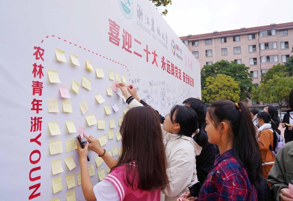 10月15日,浙江農(nóng)林大學(xué)學(xué)生通過簽名等方式寄語黨的二十大,表達(dá)大學(xué)生青春心向黨、永遠(yuǎn)跟黨走的情懷以及對黨的二十大勝利召開的祝福。