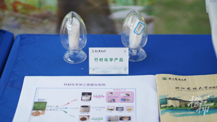 在竹文化科普區(qū),以展板的形式進(jìn)行竹類知識(shí)科普和科研成果展示。浙江農(nóng)林大學(xué)竹子研究院在現(xiàn)場(chǎng)展示了刨切微薄竹、竹纖維、竹酒等各具特色的竹子專利產(chǎn)品。此外,還有很多竹文化產(chǎn)品,如竹制錄取通知書、扇子、明信片等。