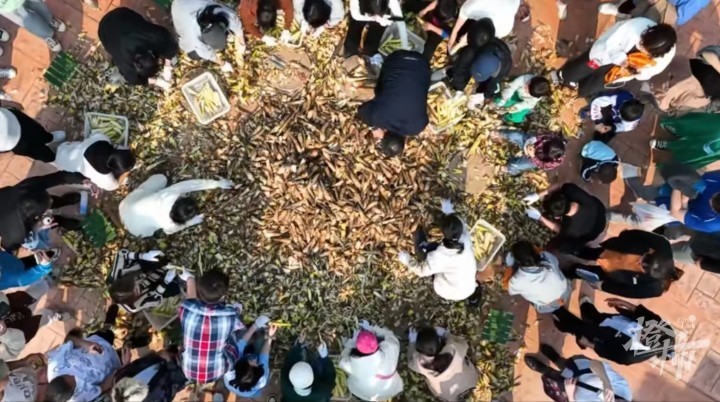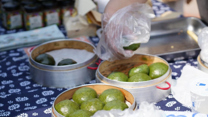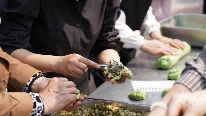 在活動(dòng)現(xiàn)場(chǎng),同學(xué)和后勤員工一起,以竹筍為食材,自己動(dòng)手制作“百縣千碗”特色點(diǎn)心筍干包和清明果兩道點(diǎn)心,蒸好后進(jìn)行現(xiàn)場(chǎng)分發(fā)。