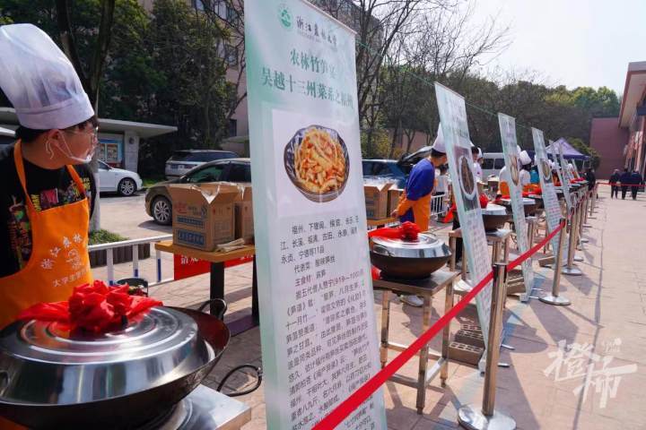 在竹筍宴品嘗區(qū),“中國(guó)烹飪大師”、該校行政總廚董銘華,帶領(lǐng)食堂廚師團(tuán)隊(duì)和上勞動(dòng)教育課的學(xué)生,現(xiàn)場(chǎng)燒制13 道筍宴菜。杭州的耕織春筍、越州的邵八珍、湖州的冬筍燉肉、溫州的清炒麻筍、臺(tái)州的毛筍干燒肉……這些都是五代十國(guó)時(shí)期吳越國(guó)下轄的十三州以筍為主要食材的特色菜,全部供師生免費(fèi)品嘗。