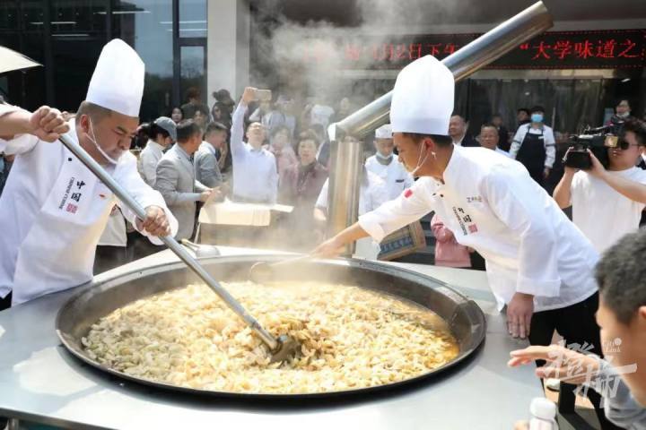 咕嘟咕嘟,熱氣騰騰的大鐵鍋里,散發(fā)出了濃郁的鮮香。隨著主持人一聲令下,鐵鍋的蓋子正式開(kāi)啟,師生人手一份,共同品嘗剛剛出鍋的咸肉春筍,感受這來(lái)自春天的味道。“這道菜用了1500斤臨安本地的雷筍和300斤遂昌的咸豬肉,用直徑1.5米的大鐵鍋燉了3個(gè)多小時(shí)。”浙江農(nóng)林大學(xué)餐飲部的葉經(jīng)理說(shuō)。