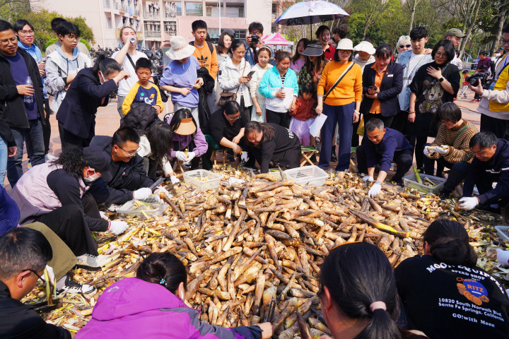 當天,浙江農(nóng)林大學用超大鐵鍋燉1800斤鮮肉春筍供學生免費嘗“鮮”,還舉辦了一系列和筍竹有關的活動,引導師生感受筍竹文化、體驗竹科技。現(xiàn)場活動包括100名師生分成50個小組,限制5分鐘剝好了1000多斤竹筍;現(xiàn)場燒制13道特色筍宴菜,而且都五代十國時期吳越國下轄十三州的特色菜;臨安知名餐飲企業(yè)以筍為食材、運用現(xiàn)代烹飪技術和加工工藝,以炒、蒸、熘、煮、爆、燜、燴等多種方式制作的6桌全筍宴;來自浙江、四川的10多家企業(yè)帶來的竹筍、竹酒、竹等各類筍竹產(chǎn)品。