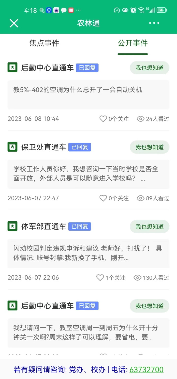 他介紹說,自從開展主題教育活動(dòng)以來,“農(nóng)林通”已處理師生各類咨詢建議553件,切實(shí)為師生解難事、辦實(shí)事,增強(qiáng)了師生的幸福感和滿意度。實(shí)現(xiàn)了“事事有回音,件件有落實(shí),樣樣有效果”的目標(biāo),提升了廣大師生的獲得感和幸福感,“有困難,農(nóng)林通”已經(jīng)成為校園流行語。