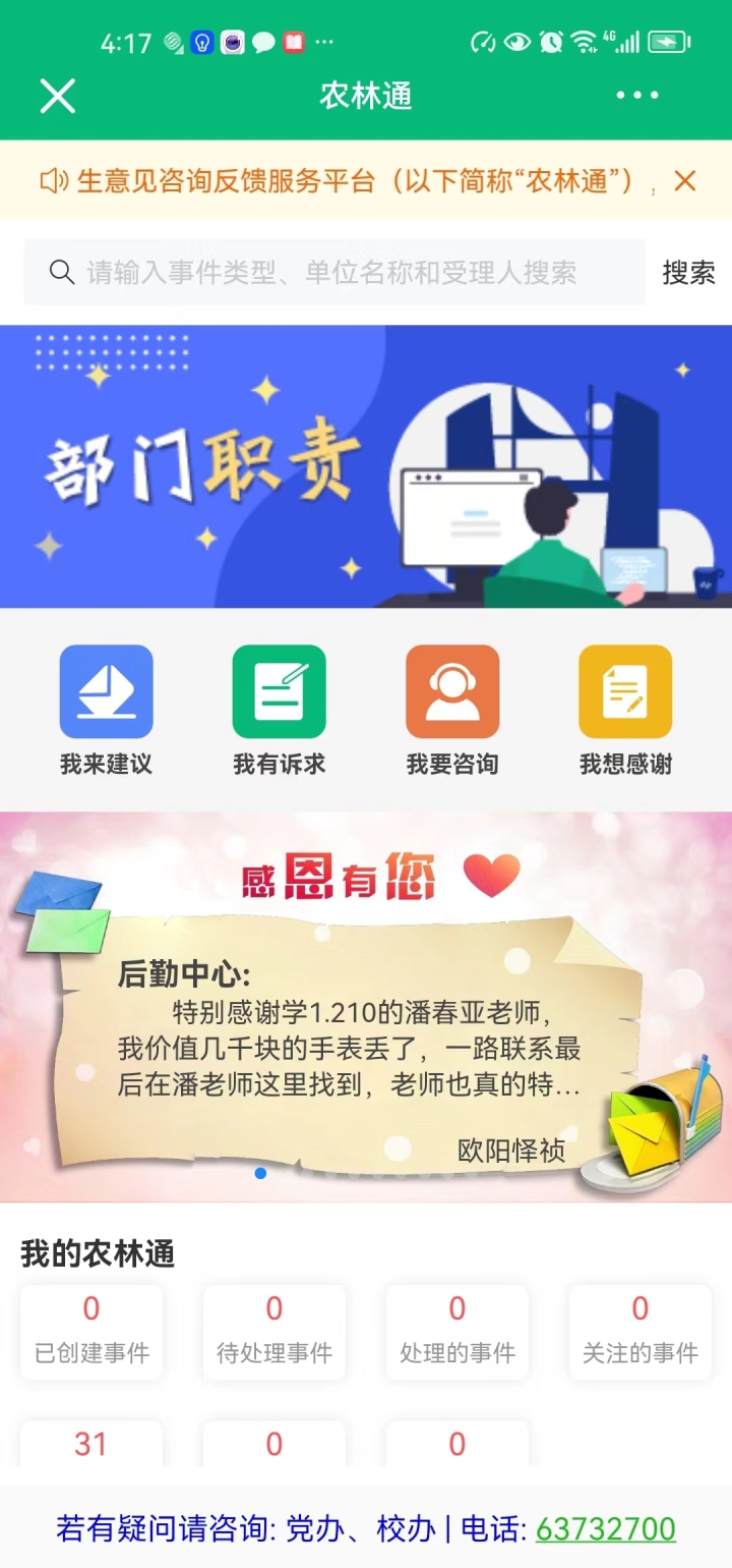 去年初,為了更加方便快捷地服務(wù)師生,將廣大師生在校期間工遇到的各類問題和意見第一時(shí)間在線傳達(dá)到相關(guān)單位,浙江農(nóng)林大學(xué)自主開發(fā)了師生咨詢意見反饋服務(wù)平臺(tái)——“農(nóng)林通”。師生的任何事情,均可通過“農(nóng)林通”手機(jī)平臺(tái)隨時(shí)隨地反映,確保師生訴求有人辦、馬上辦、能辦好。
