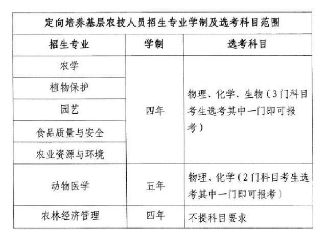 定向培養實行招生與鄉鎮農技推廣機構、基層林業崗位公開招聘工作人員并軌進行,按照“先填志愿,后簽協議”的原則按考生戶籍以縣(市、區)為單位實施定向招生(招聘)。招生對象為,全省范圍內當年報考普通高校,有意向為基層農林事業服務并與戶籍所在縣(市、區)農業農村或林業主管部門簽訂定向就業協議的學生。