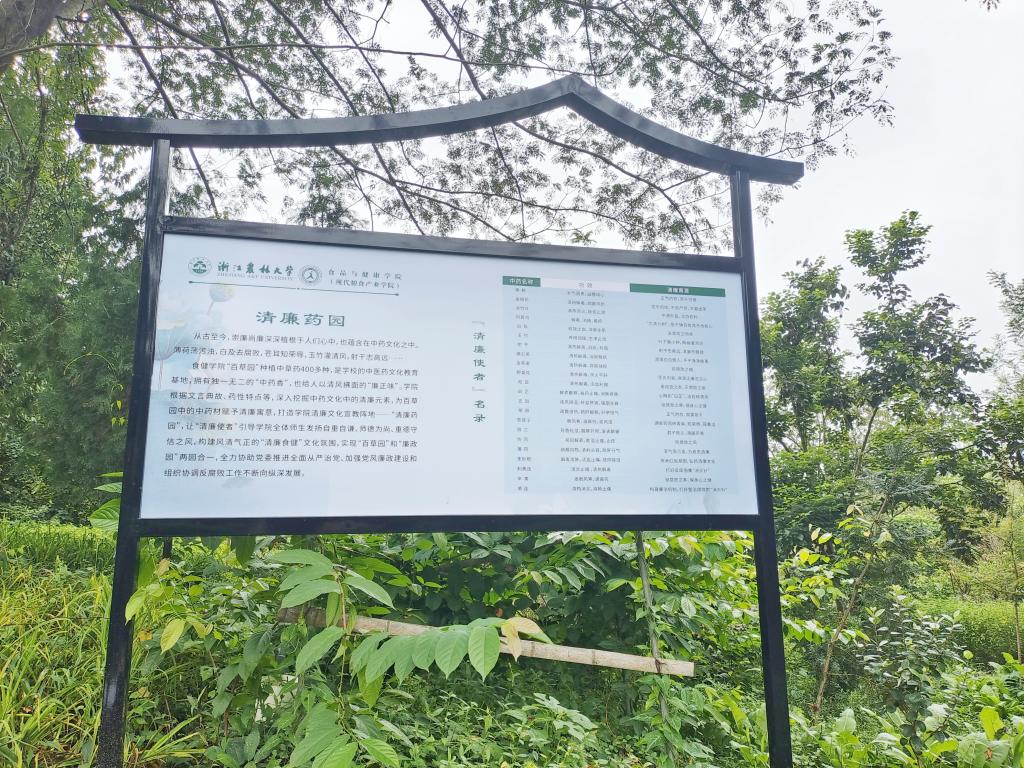 當(dāng)天,由浙江農(nóng)林大學(xué)食品與健康學(xué)院在“百草園”基礎(chǔ)上打造的“清廉藥園”正式啟用。“百草園”種植中草藥400多種,一直是學(xué)校的中藥文化教育基地,擁有獨(dú)一無(wú)二的“中藥香”。近年來(lái),為了更好地發(fā)揮百草園中的中藥材賦予清廉寓意的作用,學(xué)院根據(jù)文言典故、藥性特點(diǎn)等,深入挖掘“百草園”及中藥文化中的清廉元素,為八角蓮、金銀花、刺黃連等一批中藥材賦予清廉寓意,并授予它們“清廉使者”的身份,通過(guò)多種形式進(jìn)行呈現(xiàn)其“廉正味”,將百草園打造成為清廉文化宣教陣地——“清廉藥園”。