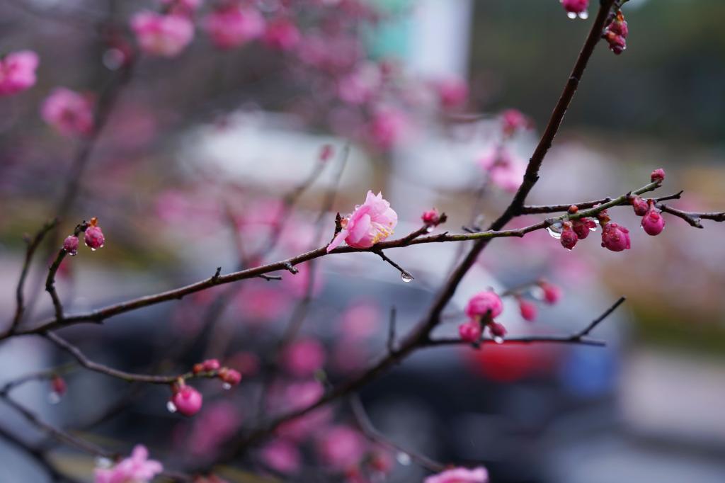 在位于浙江杭州臨安的浙江農林大學東湖校區內,梅花在綿綿細雨中吐香綻放。