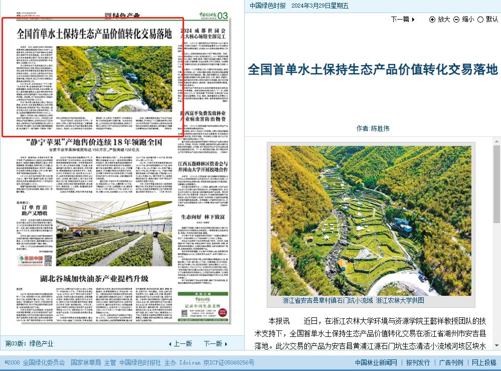 《中國綠色時報》頭條:全國首單水土保持生態產品價值轉化交易落地