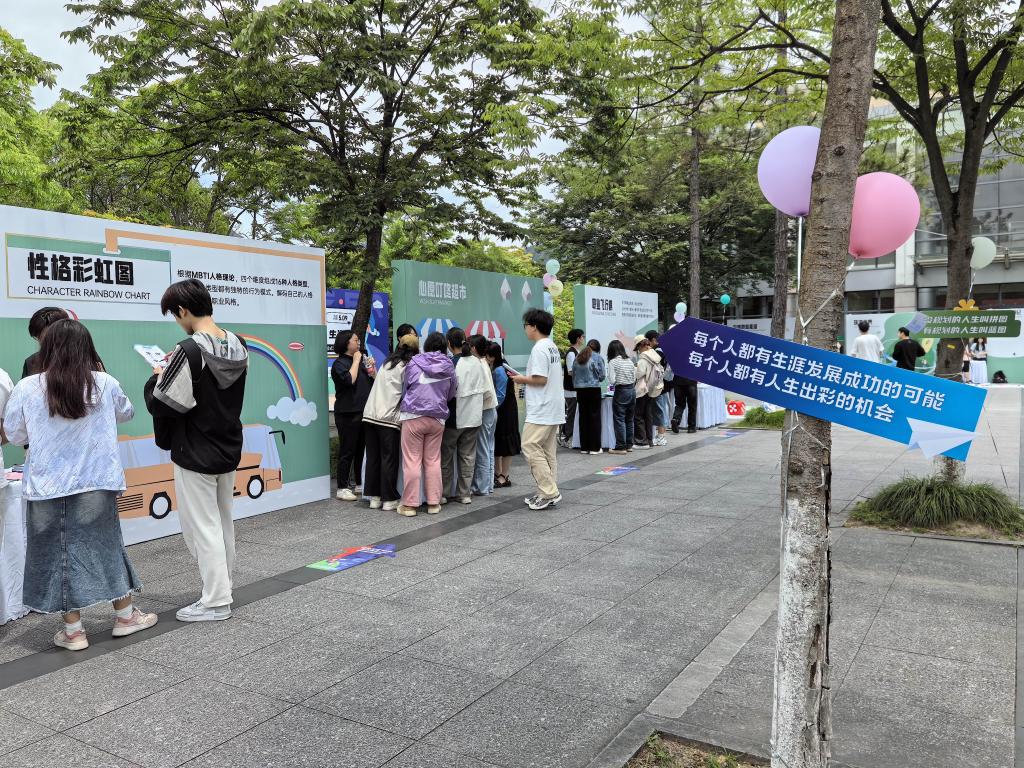 走近活動現場,映入眼簾的是排列有序的系列活動攤位。“自我探索”區域中,同學們在第一個攤位“啟航”處領取活動手冊,開啟玩轉職場的大門;在“葡萄熟了”攤位處,同學們將自己的特性與圖中葡萄里的各個關鍵詞比照對應,最終獲取屬于自己的葡萄類型貼紙;“性格彩虹圖”攤位志愿者帶領同學們通過科學的“MBTI”人格理論,解碼人格類型,找到職業風格。一枚枚代表不同性格的彩虹字母貼紙被同學們認真地貼在了手冊中,象征著絢爛的未來從這里出發。