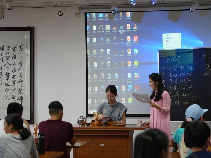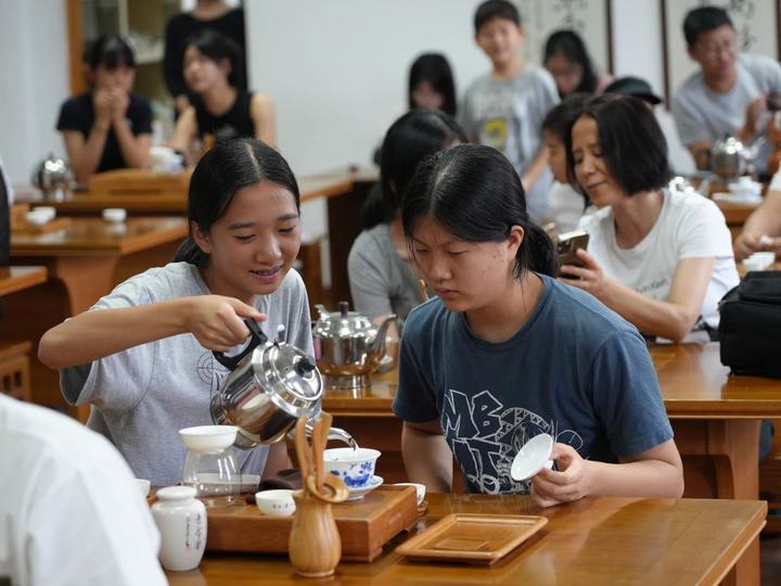 參加體驗活動的是一群來自美國華府青年義工俱樂部的華裔青少年們。茶學院專任教師王園瑞博士與茶學院21級學生劉星雨為他們準備了一堂中英文結合的中國茶藝教學課。