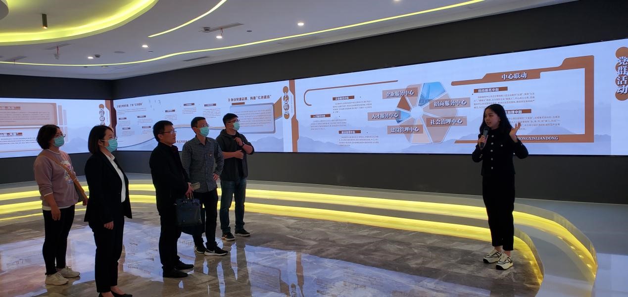 在智慧黨建墻前,黨員們認真聽取了中心工作人員的情況介紹。中心建設了“山湖”青鋒智慧黨建平臺,通過與企業服務中心、招商服務中心、人才服務中心、建設管理中心和社會治理中心等聯動,構建了“成長藍”、“黨建紅”、“公益綠”、“活力橙”、“幸福粉”的工作服務體系,實現服務園區、社區黨建“共建、共享、共富”。中心分設智慧云館、積分超市、城市書屋、社團創享等10余個“功能區”,引入智能導服、沉浸體驗,在“聲”“光”“電”“味”的現代展示方式中,突出黨建工作的時代特色,智慧化、互動性、科技感十足。
