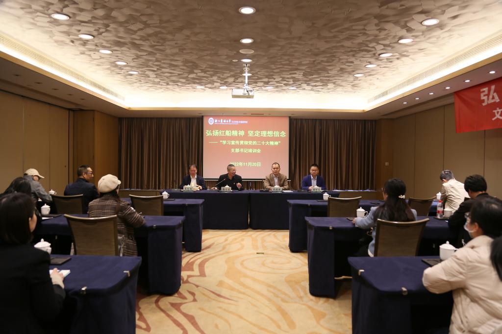在理論學(xué)習(xí)階段,嘉興秀洲區(qū)委黨校書記杜建新作《淺談黨的二十大新思想新論斷及紅船精神》培訓(xùn)報(bào)告,文法學(xué)院黨委書記朱紅東作《黨支部書記應(yīng)知應(yīng)會(huì)素質(zhì)能力》專題輔導(dǎo),文法學(xué)院紀(jì)委書記潘軍可作《以師德師風(fēng)建設(shè)為核心 縱深推進(jìn)“清廉學(xué)院”建設(shè)》工作部署。