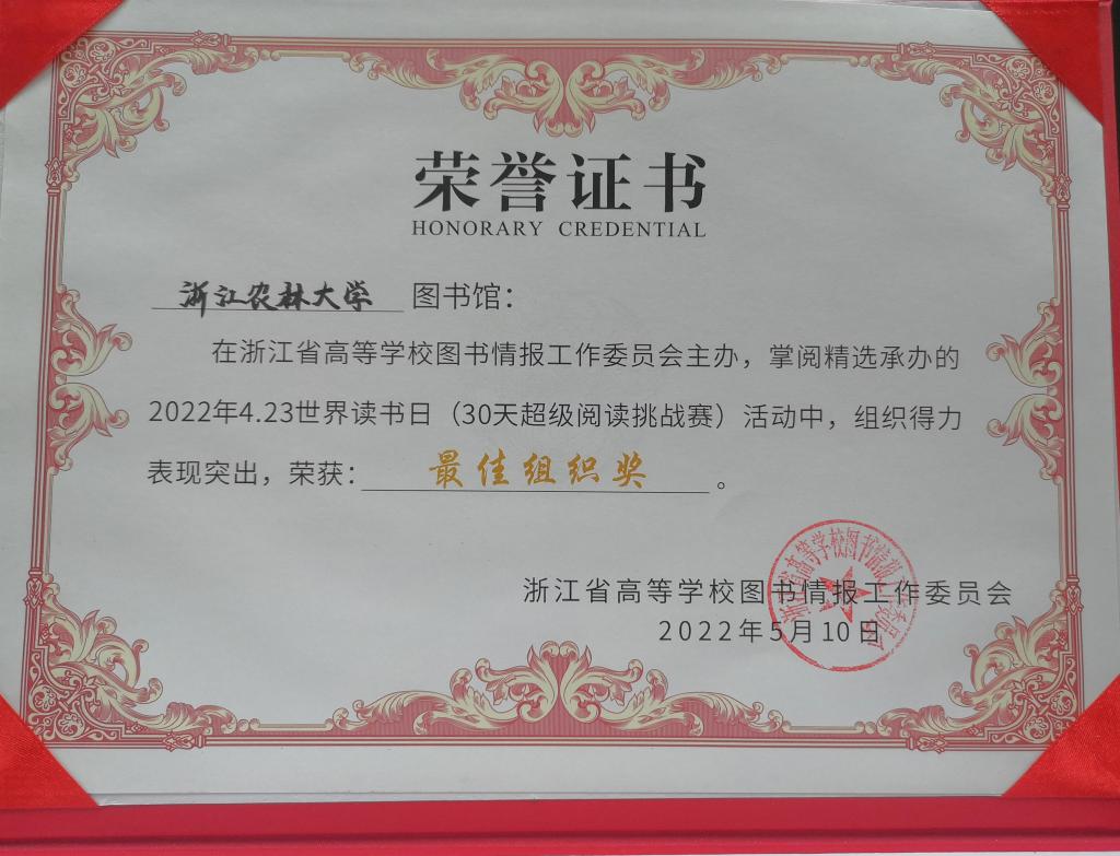 經(jīng)多媒介多渠道廣泛宣傳發(fā)動(dòng),我校圖書館獲省高校圖工委主辦的2022“世界讀書日”閱讀活動(dòng)最佳組織獎(jiǎng),食健學(xué)院方晴同學(xué)和暨陽學(xué)院毛玲輝同學(xué)獲最美書評獎(jiǎng)。