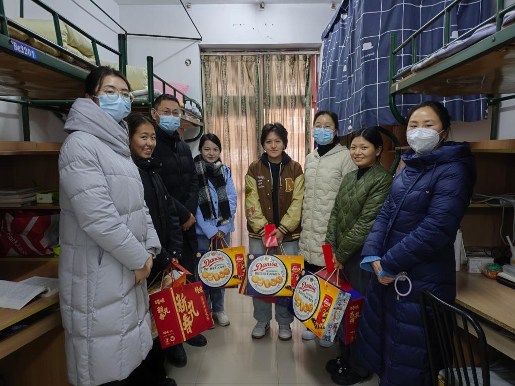 1月10日下午,食健學(xué)院相關(guān)領(lǐng)導(dǎo)與輔導(dǎo)員一同深入學(xué)生寢室看望慰問寒假留校學(xué)生,并代表學(xué)院送上慰問大禮包和新春祝福。