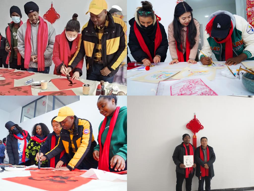 書畫導師汪曉亮、夏偉革、葉青、汪起文等與國際學生一起寫福字、畫年畫、貼春聯(lián),感受濃濃的中國傳統(tǒng)年味。