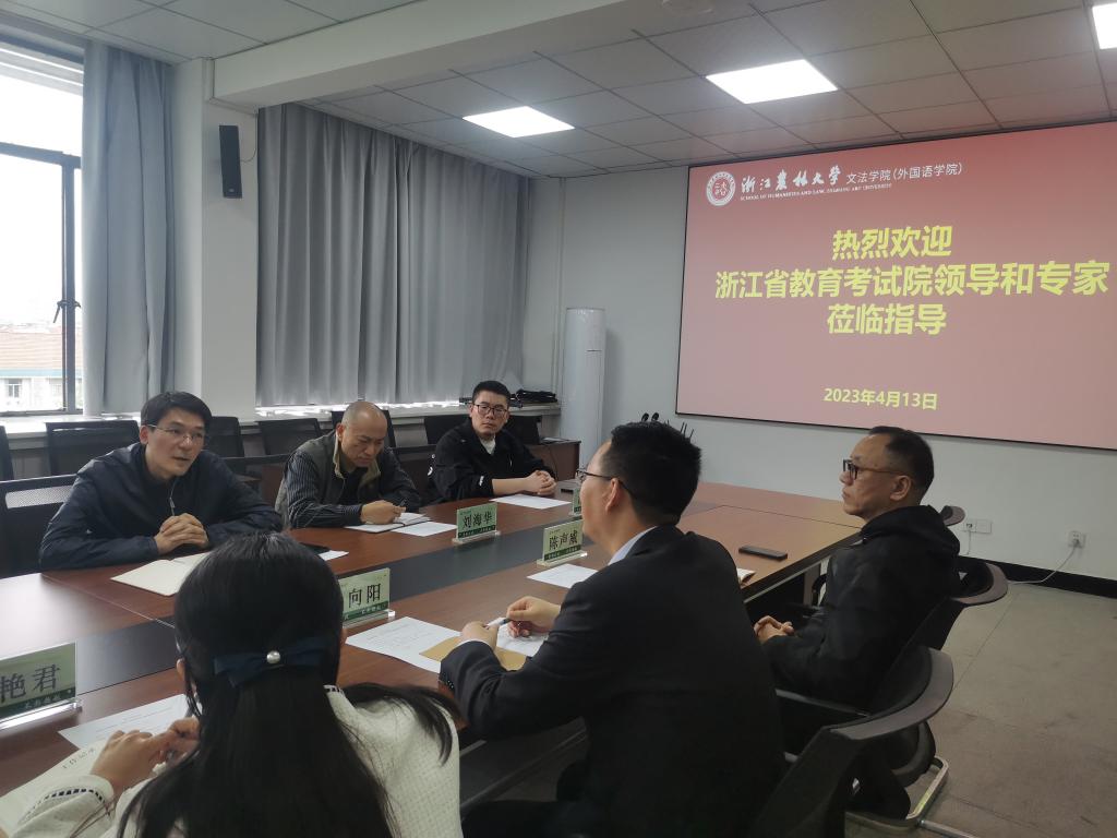 4月13日,浙江省教育考試院社會考試部周密主任一行三人來我校檢查全國大學(xué)英語四、六級口語考試考點(diǎn)建設(shè)情況。學(xué)校教務(wù)處 和文法學(xué)院相關(guān)負(fù)責(zé)人及相關(guān)人員陪同檢查。