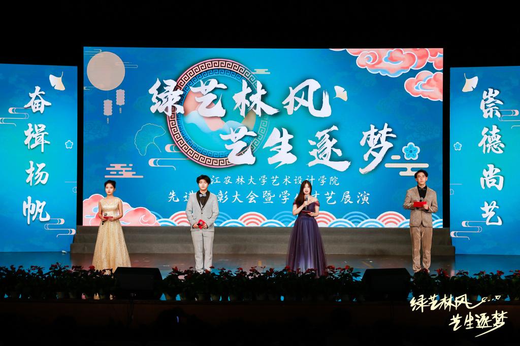 表彰大會對先進集體和個人進行了表彰,三位優秀學長學姐代表進行經驗分享。學生才藝展演以“綠藝林風,藝生逐夢”為主題,由藝心、藝韻、藝路、藝夢四個篇章組成。
