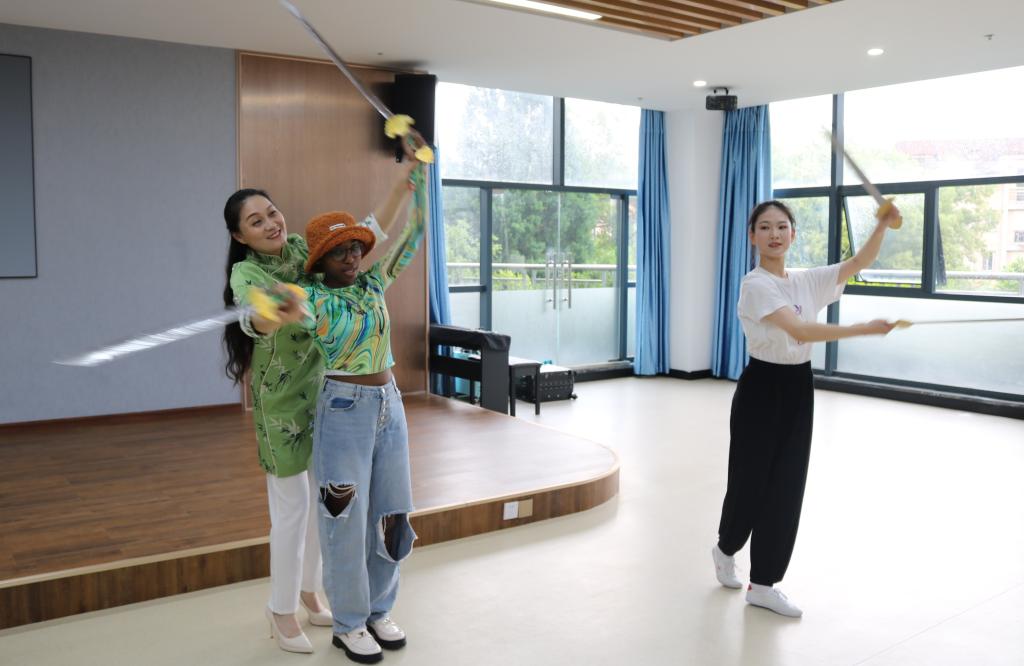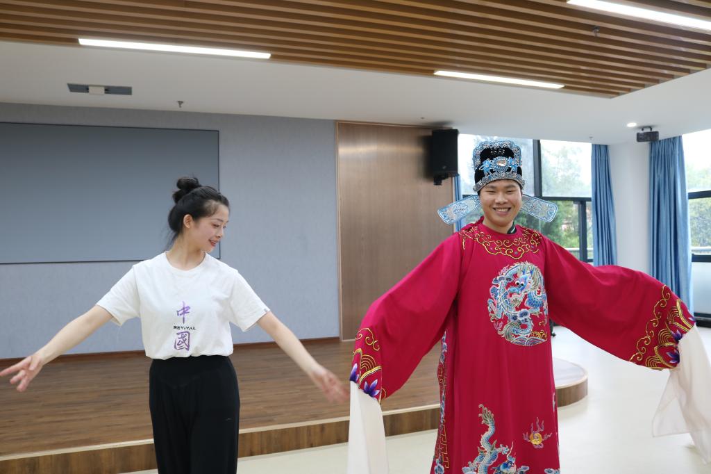 浙江音樂學院副教授徐耀芳做了主題為《戲曲之“美”》的講座,幫助國際生了解中國戲曲文化的內涵。浙江音樂學院戲劇系的同學現場表演了器樂、水袖、雙劍、折扇和越劇經典曲目。我校國際生們則在戲劇魅力的感染下,饒有興致地體驗學習戲曲臺步、試穿戲服、學習表演等。