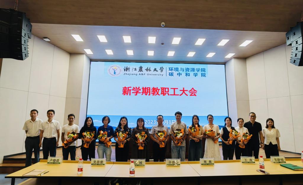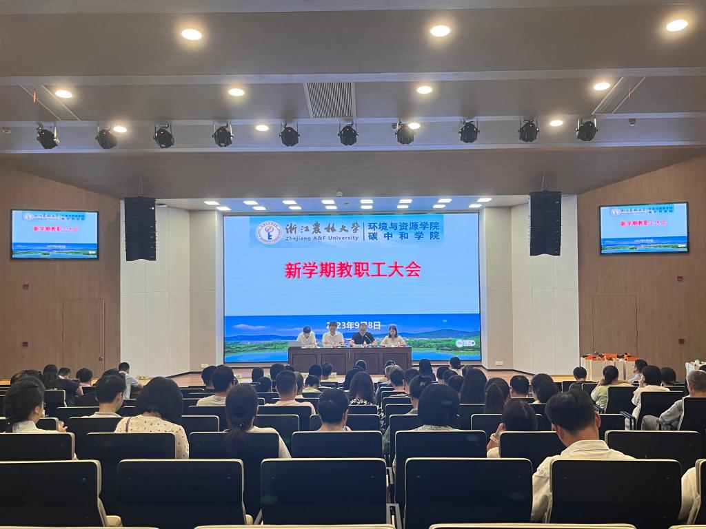 2023年9月8日上午,環資院、碳中和學院新學期全體教職工大會在學3國際報告廳舉行,學院黨政領導班子成員出席會議,會議由學院黨委書記侯錫銘主持,全體教職工參加會議。