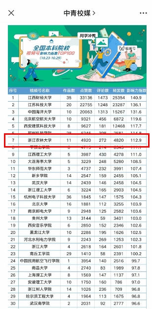 近日,在中青校媒最新發(fā)布的“全國高校(本科院校/職業(yè)院校)視頻號影響力指數(shù)TOP100(10.23-10.29)”排行榜中,我校官方視頻號位居全國本科高校第七,浙江本科高校第一,為浙江本科高校中唯一進入影響力指數(shù)前十的高校視頻號。