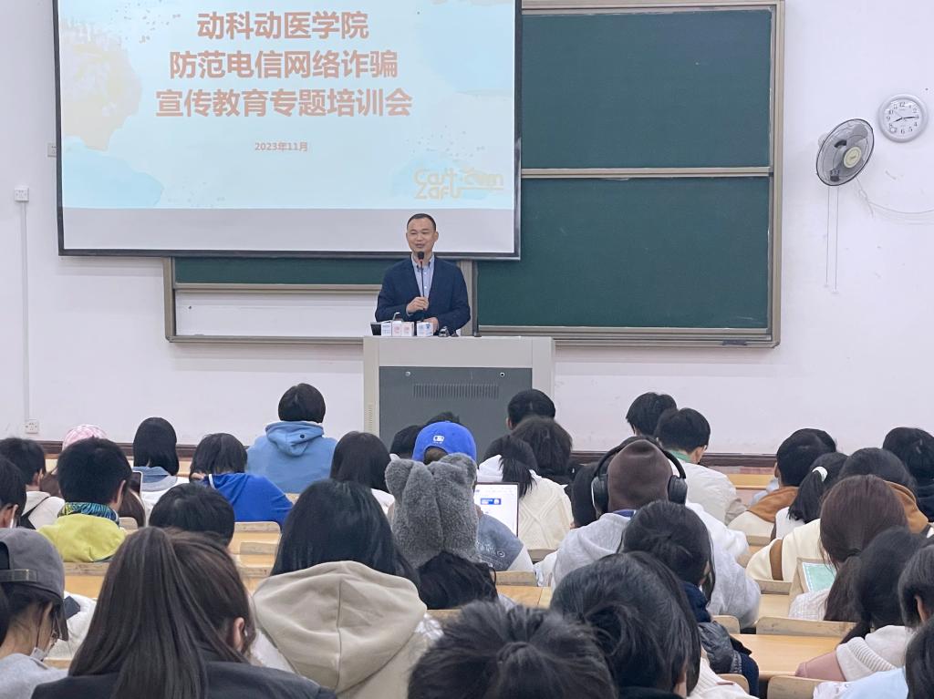 11月22日晚,動科動醫(yī)學院防范電信網(wǎng)絡詐騙宣傳教育專題培訓會在教5202順利召開。學院相關工作負責人、輔導員和2023級全體本科生參會。