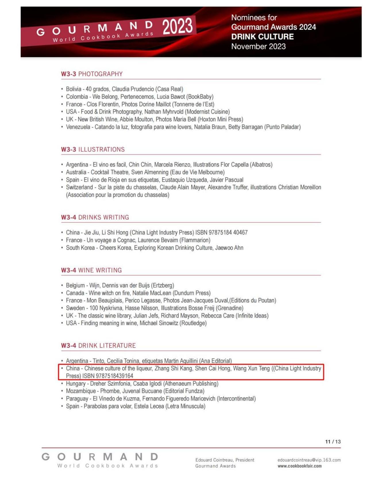 據悉,世界美食美酒圖書大獎由法國君度世家繼承人愛德華·君度(Edouard Cointreau)于1995年創立,是全球最權威的美食美酒圖書獎項,被譽為國際美食美酒“奧斯卡獎”。每年,該獎項會對全球205個國家出版的十幾萬種飲食類圖書進行市場采集、整理和比較,評選出最佳美食和美酒圖書獎項。