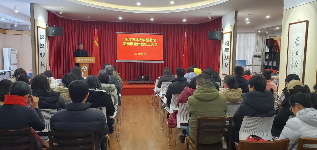 館長王欣回顧了上年度重點和亮點工作,并對新學期重點工作做出部署。他表示,今年是學校實施“十四五”發展規劃的關鍵之年,更是建設高水平大學和林學登峰學科的攻堅之年、實干之年,圖書館要主動服務學校中心工作,全力完成學校下達的工作任務,尤其要在資源建設和優化服務方面取得突破。2024年要著力在以下四個方面加強工作:一是拓資源,全館上下要群策群力,全力拓寬資源渠道,彰顯圖書館藏書的人文溫度;二是優服務,要優化空間,主動提升服務質量,積極回應師生訴求,提升滿意度;三是興文化,要多渠道持續做好閱讀推廣,通過辦好第十七屆讀書節等努力建設書香校園;四是塑形象,要真抓實干,不空談、不扯皮、不爭論,加強隊伍培養,持續改進工作作風。