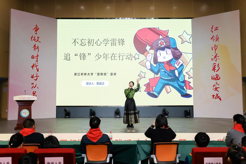 活動儀式上,魏玲玲為青山湖科技城二小授牌浙江農(nóng)林大學雷鋒班實踐基地。“雷鋒班”成員、全國學雷鋒活動示范點服務(wù)窗口宣講員黃璽潔,以《不忘初心學雷鋒,追“鋒”少年在行動》為主題做了精彩的宣講。