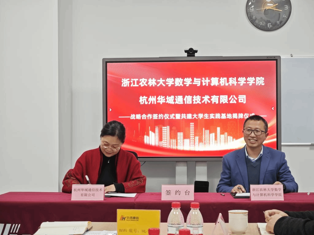 近日,數計學院與杭州華域通信技術有限公司在青山湖科技園舉行了戰略合作協議簽約儀式暨大學生實習實踐基地揭牌儀式。數計學院黨委書記馮金明及相關負責人,華域通信技術有限公司董事長錢靜,以及雙方相關部門、專業負責人出席儀式。