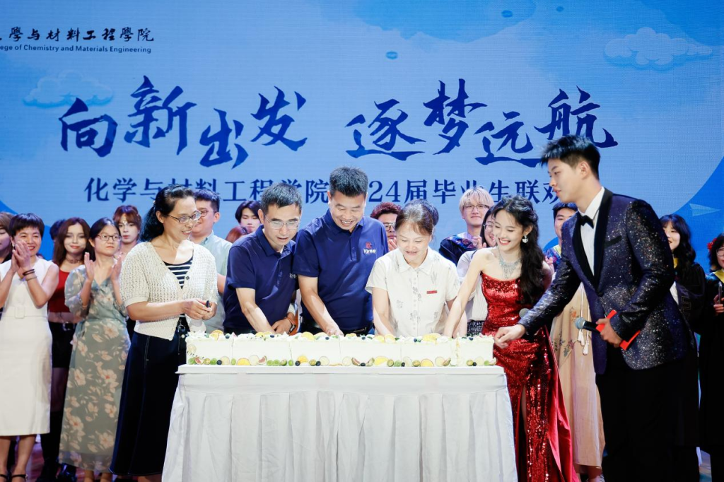 聯歡會在學生們自己制作的《在場》的暖場視頻中拉開序幕,化材學院團委藝術團精心策劃了一系列節目,包括歌舞、器樂演奏、朗誦、走秀和舞臺劇等,以畢業生和導師為主角,突出師生互動的特色。教師代表王星、楊瑾、蔣明月、趙國敏、胡玲玲、王雪、姜柏羽、李彩彩、戚懿予以及畢業生代表們的舞蹈與合唱將現場氣氛推向高潮,贏得了熱烈的掌聲和喝彩。在聯歡會尾聲,化材學院為2024屆畢業生準備了一個特別環節,由所有老師和畢業生攜手上臺共同切下寓意豐富的“逐夢蛋糕”。這一儀式象征著畢業生們共同追逐夢想的決心以及他們在學術和人生旅程中邁出的新步伐。