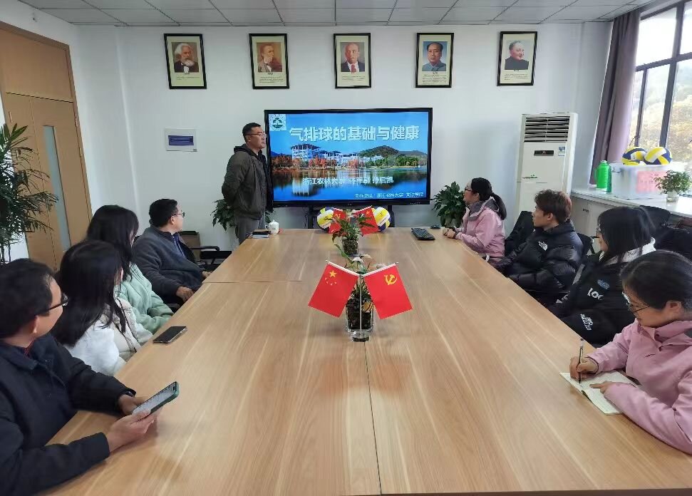 孫啟凱講述了氣排球運動的由來與發展歷程,介紹了臨安地區及浙江農林大學氣排球比賽的情況,他表示,氣排球由硬排球發展而來,技術要求低,安全性高,很適合作為全民健身運動。此外,他還結合理論教學與實踐操作,在衣錦體育館進行了基礎規則的講解和動作示范。