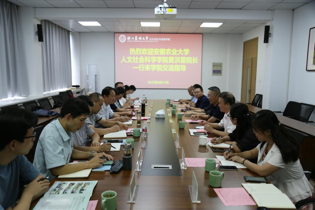 8月14日,安徽農業大學人文社會科學學院院長黃洪雷一行10人到文法學院交流合作,學院院長魯可榮、黨委書記朱紅東等全體班子成員以及法學學科、中文學科和公共管理學科等相關負責人參與交流座談。